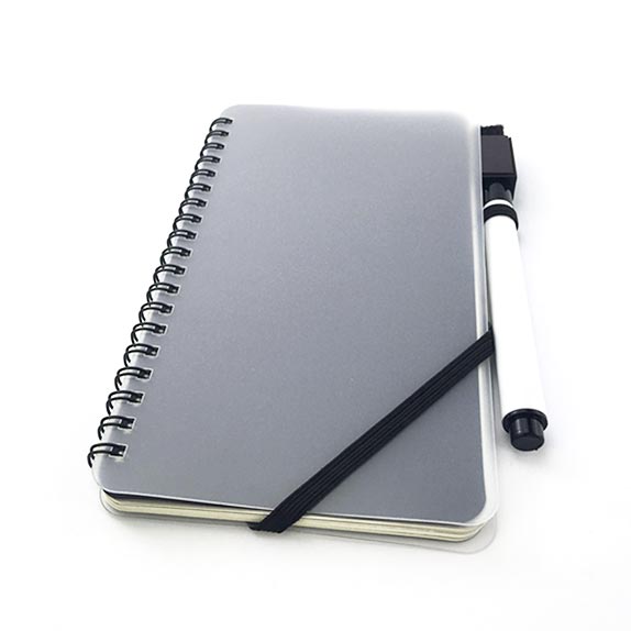 封面為PP,內含68張60克劃線紙+2張白卡 紙,黑色線圈,銀色鉚釘處套黑色橡筋,配1.0黑油墨圓珠筆